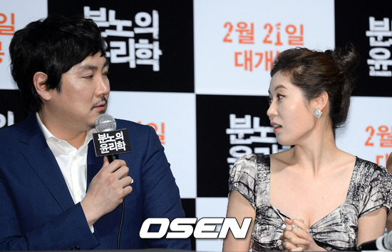 14일 오후 서울 건대 롯데시네마에서 진행된 '분노의 윤리학' 언론배급시사회에서 조진웅과 문소리가 의견차이에 대해 이야기를 나누고 있다.