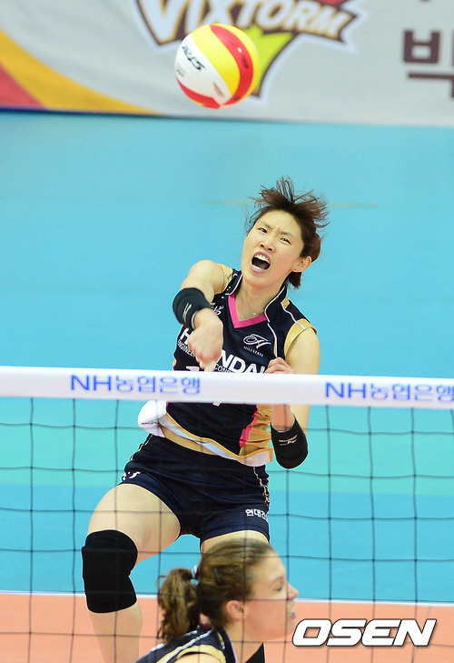 14일 오후 수원 실내체육관에서 열린 '2012-2013 NH농협 V-리그' 여자부 현대건설과 흥국생명의 경기 1세트 박슬기가 스파이크를 날리고 있다.