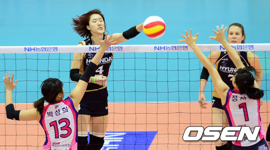 14일 오후 수원 실내체육관에서 열린 '2012-2013 NH농협 V-리그' 여자부 현대건설과 흥국생명의 경기 1세트 황연주가 공격을 시도하고 있다.
