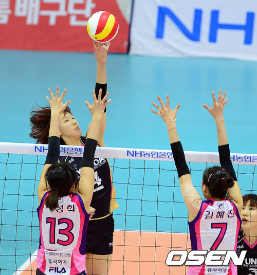 14일 오후 수원 실내체육관에서 열린 '2012-2013 NH농협 V-리그' 여자부 현대건설과 흥국생명의 경기 1세트 황연주가 공격을 시도하고 있다.