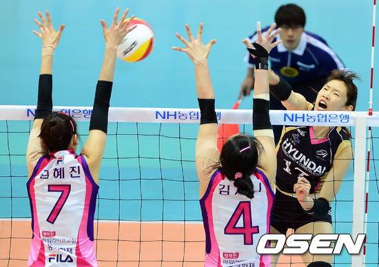 14일 오후 수원 실내체육관에서 열린 '2012-2013 NH농협 V-리그' 여자부 현대건설과 흥국생명의 경기 1세트 박슬기가 스파이크를 날리고 있다.
