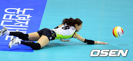 14일 오후 수원 실내체육관에서 열린 '2012-2013 NH농협 V-리그' 여자부 현대건설과 흥국생명의 경기 1세트 김연견이 볼을 살리기위해 슬라이딩 하고 있다.