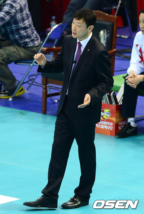 14일 오후 수원 실내체육관에서 열린 '2012-2013 NH농협 V-리그' 남자부 KEPCO와 대한항공의 경기 1세트 KEPCO 이재구 감독대행이 선수들에게 지시를 하고 있다.