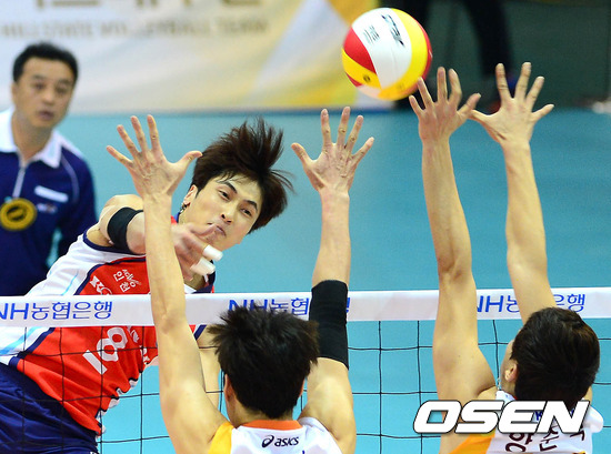 14일 오후 수원 실내체육관에서 열린 '2012-2013 NH농협 V-리그' 남자부 KEPCO와 대한항공의 경기 1세트 김학민이 공격을 시도하고 있다.
