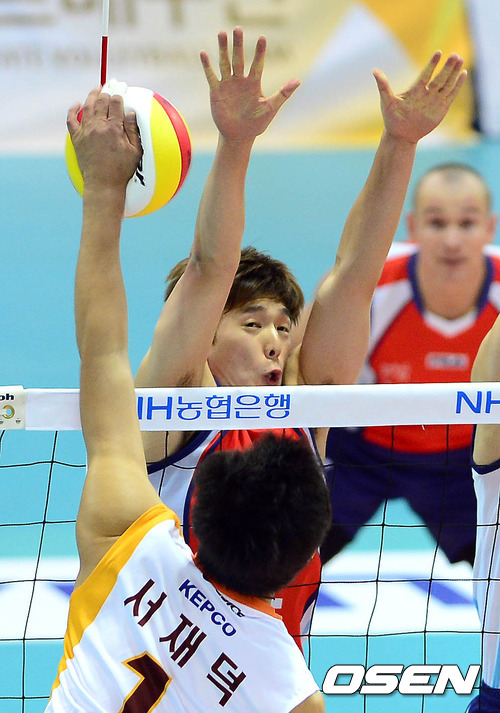 14일 오후 수원 실내체육관에서 열린 '2012-2013 NH농협 V-리그' 남자부 KEPCO와 대한항공의 경기 1세트 한선수가 서재덕의 공격을 브로킹 하고 있다.