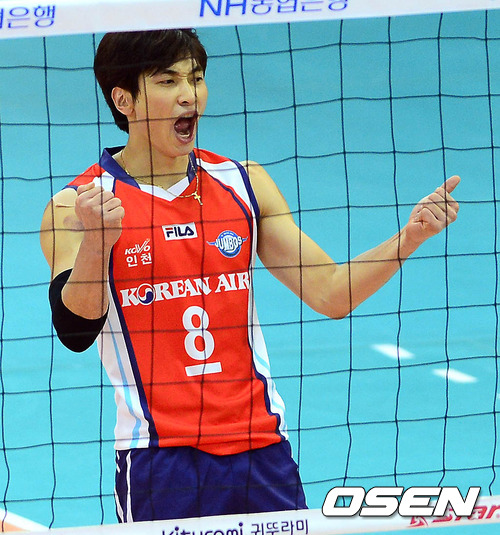 14일 오후 수원 실내체육관에서 열린 '2012-2013 NH농협 V-리그' 남자부 KEPCO와 대한항공의 경기 1세트 대한항공이 득점하자 김학민이 환호하고 있다.