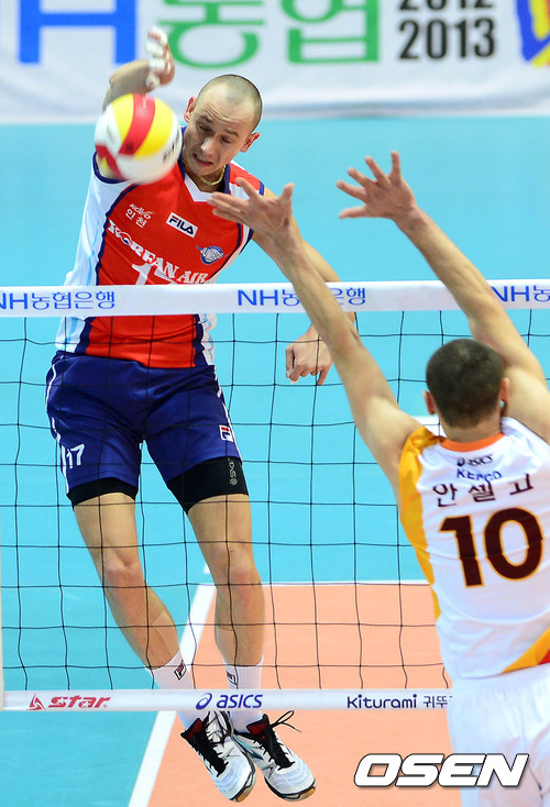 14일 오후 수원 실내체육관에서 열린 '2012-2013 NH농협 V-리그' 남자부 KEPCO와 대한항공의 경기 1세트 마틴이 공격을 시도하고 있다.