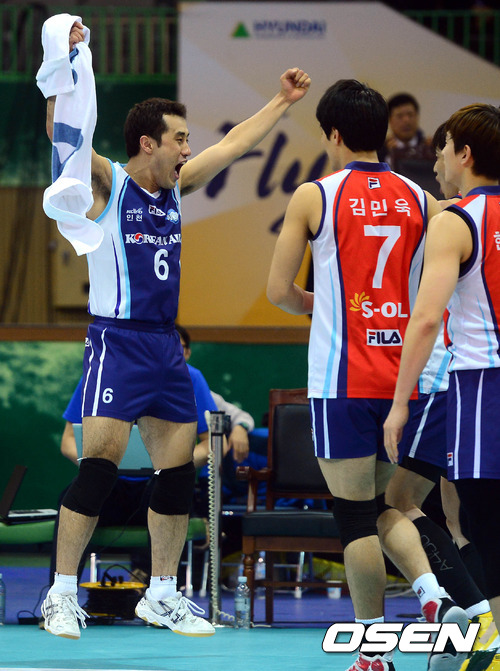 14일 오후 수원 실내체육관에서 열린 '2012-2013 NH농협 V-리그' 남자부 KEPCO와 대한항공의 경기 3세트 대한항공이 앞서가는 가운데, 작전타임에서 최부식이 환호하고 있다.