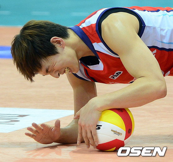 14일 오후 수원 실내체육관에서 열린 '2012-2013 NH농협 V-리그' 남자부 KEPCO와 대한항공의 경기 3세트 한선수가 리시브에 실패하자 아쉬워하고 있다.