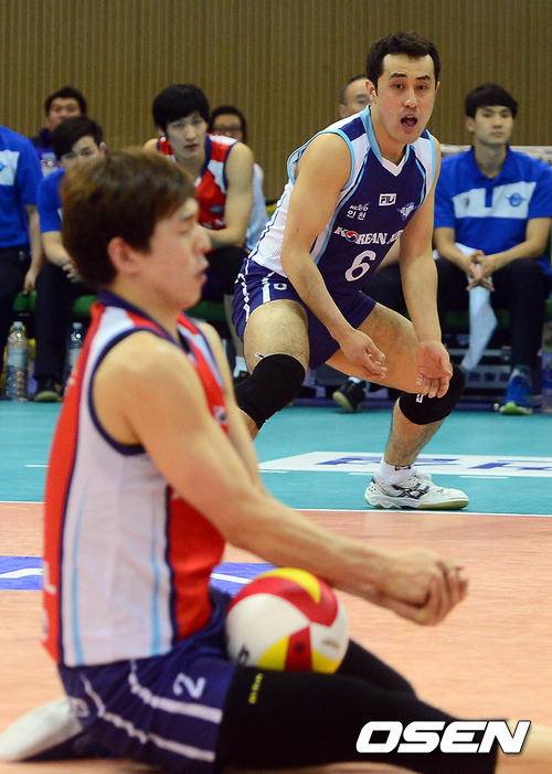 14일 오후 수원 실내체육관에서 열린 '2012-2013 NH농협 V-리그' 남자부 KEPCO와 대한항공의 경기 3세트 한선수가 리시브에 실패하는 모습을 최부식이 바라보고 있다.
