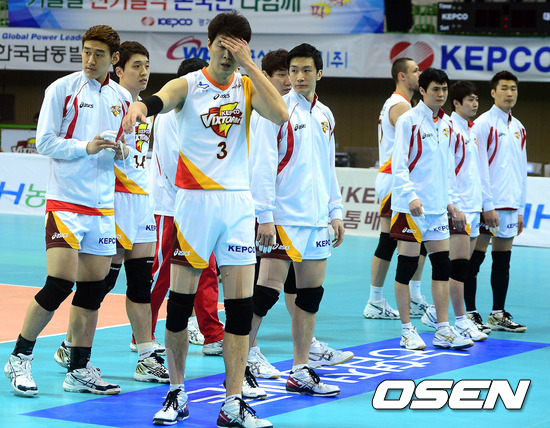 14일 오후 수원 실내체육관에서 열린 '2012-2013 NH농협 V-리그' 남자부 KEPCO와 대한항공의 경기 종료 후 KEPCO 선수들이 팬들에게 인사를 하기위해 관중석으로 향하고 있다.