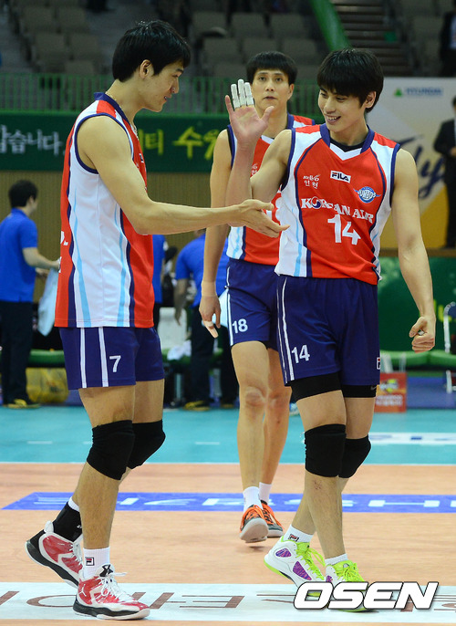 14일 오후 수원 실내체육관에서 열린 '2012-2013 NH농협 V-리그' 남자부 KEPCO와 대한항공의 경기 종료 후 대한항고 김민욱(왼쪽)과 심홍석이 하이파이브를 하고 있다.