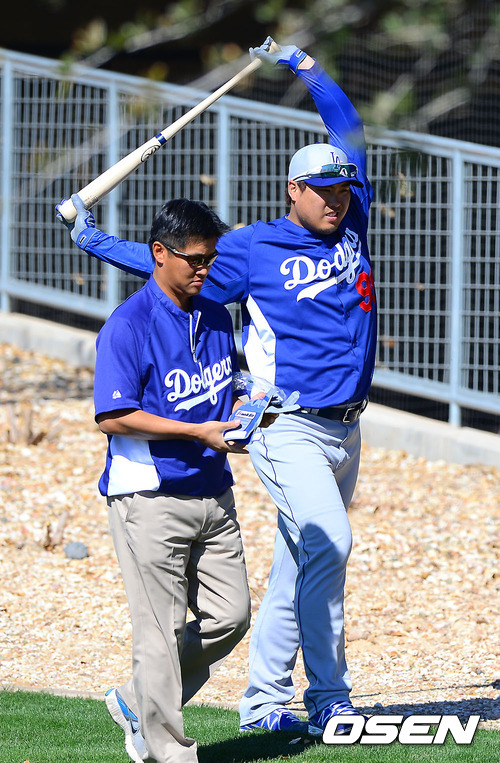 류현진은 스프링캠프 개막 3일째 맞아 돈 매팅리 감독과 릭 허니컷 투수코치가 보는 앞에서 첫 불펜피칭에 나선 류현진은 스케쥴에 따라 피칭 뒤 타격훈련도 가졌다. 그것도 왕년의 홈런왕으로 유명한 마크 맥과이어 타격코치가 따라붙었다.