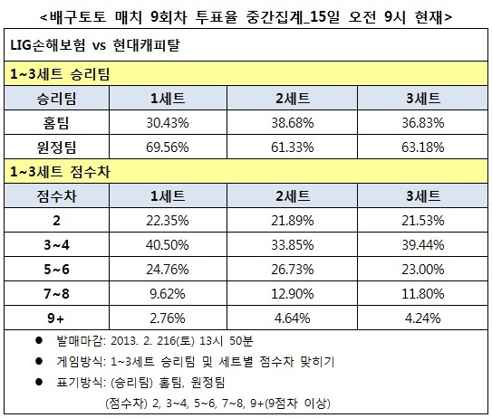 [배구토토] 국민체육진흥공단(www.kspo.or.kr)이 발행하는 체육진흥투표권 수탁사업자인 스포츠토토의 공식 온라인 발매사이트 베트맨(www.betman.co.kr)은 오는 9일 오후 2시 구미박정희체육관에서 펼쳐지는 LIG-현대캐피탈전을 대상으로 하는 배구토토 매치 9회차 게임 투표율 중간집계 결과, 배구팬들은 원정팀 현대캐피탈이 홈팀 LIG를 상대로 우세한 경기를 펼칠 것으로 예상했다.