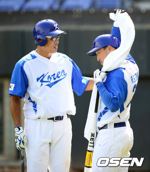 이승엽이 땀을 닦는 손아섭과 이야기를 나누고 있다.