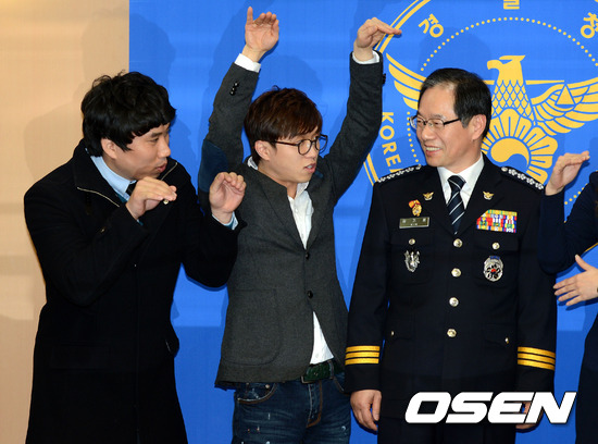 15일 오후 서울 서대문 경찰청에서 열린 '감사패 수여 및 명예경찰 위촉식'에서 개그팀 용감한 녀석들이 김기용 경찰청장을 보며 촬영 포즈를 취하고 있다.