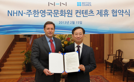 NHN 김상헌 대표(오른쪽)와 주한영국문화원 롤란드 데이비스 원장이 15일 주한영국대사관에서 콘텐츠 제휴를 위한 업무협약식을 갖고 있다.