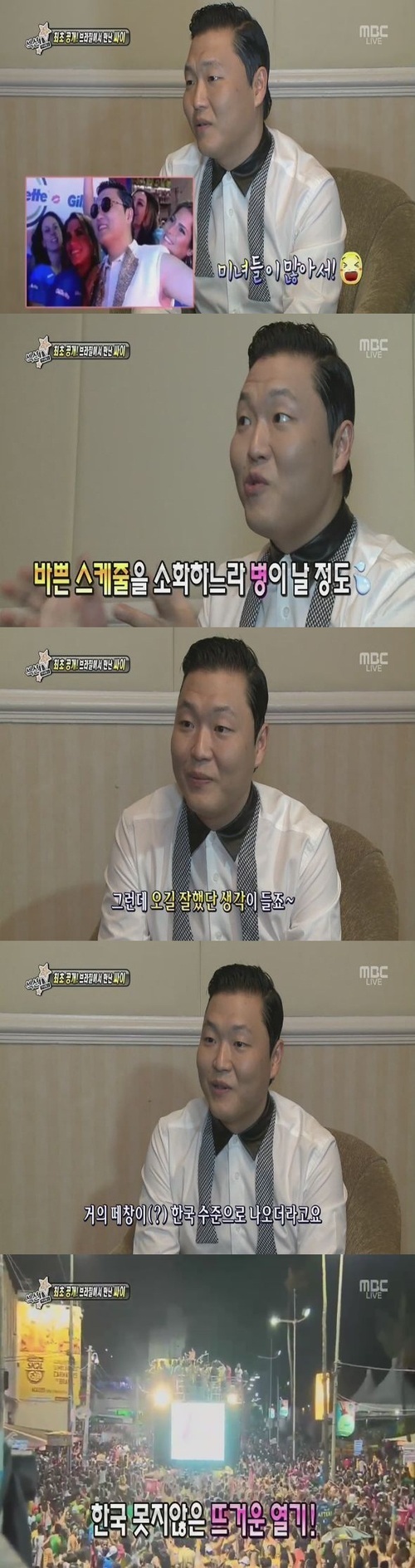 싸이는 이날 방송에 출연해 "브라질은 정말 좋다"며 "미인이 정말 많다"며 특유의 장난기 넘치는 미소를 보였다.