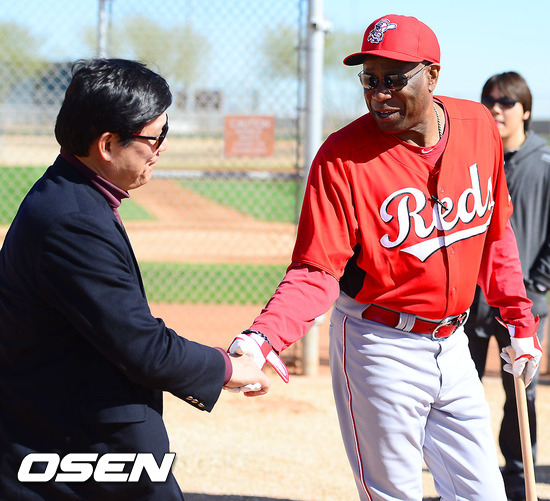 신시내티 더스티 베이커 감독이 허구연 해설위원과 악수를 나누고 있다