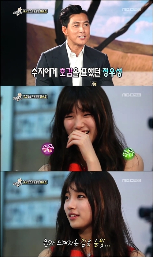 수지는 지난 15일 방송된 MBC 연예정보프로그램 ‘섹션TV 연예통신’에서 최근 정우성이 자신에게 호감을 표현한 것에 대해 “정말 좋았다”고 솔직하게 말했다.
