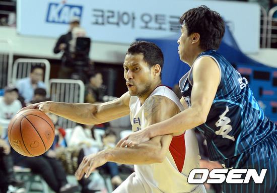 16일 오후 전주실내체육관에서 열린 'KB 국민카드 2012-2013 프로농구' 전주 KCC와 고양 오리온스의 경기 4쿼터, 오리온스 전태풍이 KCC 임재현 수비를 뒤로한채 드리블 하고 있다.