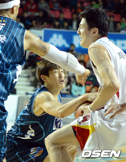 16일 오후 전주실내체육관에서 열린 'KB 국민카드 2012-2013 프로농구' 전주 KCC와 고양 오리온스의 경기 4쿼터, 오리온스 최진수와 KCC 신명호가 볼다툼을 하고 있다.