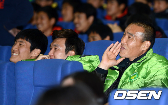전북 최은성이 신입선수 소개를 보며 미소짓고 있다.