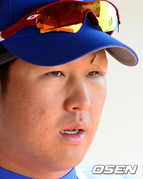 지난 15일 훈련 도중 불규칙바운드가 된 볼에 왼쪽 눈두덩이가 찢어지는 부상을 당한 최정이 훈련을 하기 위해 그라운드에 들어서고 있다. 최정은 부상 직후 바로 병원으로 후송, 7바늘을 꿰맨뒤 복귀했다.