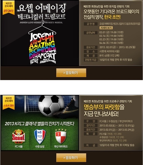 먼저 브로드웨이의 전설적 명작인 '요셉 어메이징 테크니컬러 드림코트' 뮤지컬 관람권을 제공하는 컬처라운지 공연 26탄이 내달 25일까지 진행된다. 벳볼 300개 이상을 보유한 베트맨 회원은 베트맨 홈페이지 컬처라운지 이벤트 페이지에서 누구나 응모할 수 있다. 당첨된 회원에게는 샤롯데 시어터에서 열리는 '요셉 어메이징' R석 관람권(45명, 1인 2매)을 증정한다.