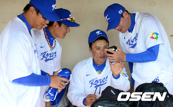 이대호, 손시헌, 이승엽, 서재응이 더그아웃에서 휴대폰을 보며 이야기를 나누고 있다.