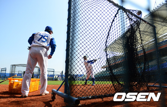 김태균이 류중일 감독의 토스를 받아 배팅 훈련을 하고 있다.