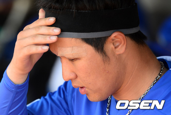 지난 15일 훈련 도중 불규칙바운드가 된 볼에 왼쪽 눈두덩이가 찢어지는 부상을 당한 최정이 오후 훈련을 준비하고 있다.