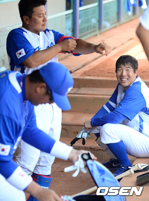 김현수가 훈련도중 더그아웃에서 휴식을 취하며 미소짓고 있다.