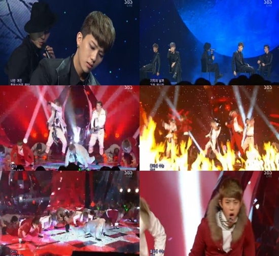 B.A.P는 17일 오후 방송된 SBS '인기가요‘'에서 두 번째 미니앨범의 수록곡 ‘빗소리’와 타이틀 곡 ‘원샷(One Shot)’의 무대를 연이어 꾸몄다.
