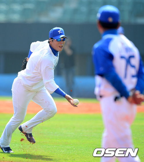 류중일 감독이 강정호의 수비 모습을 지켜보고 있다.