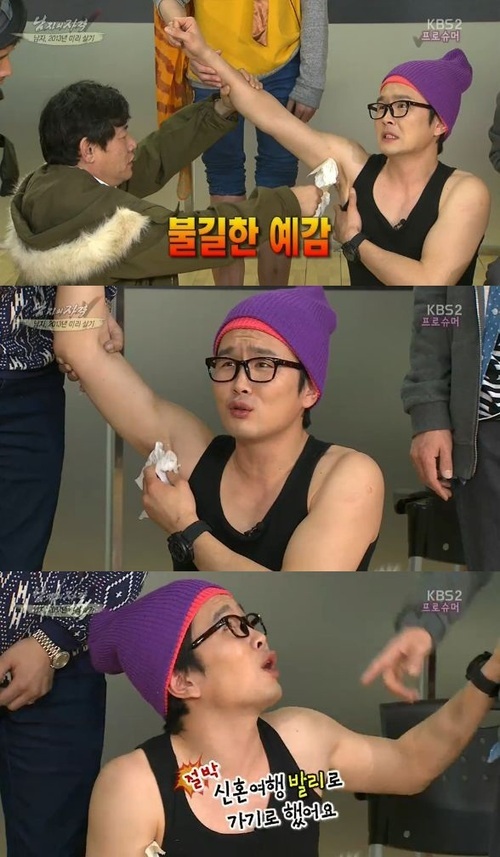 이 과정에서 윤형빈은 겨드랑이 털 제모 대상자로 뽑혔다. 반 강제로 겨드랑이를 드러낸 윤형빈은 이경규의 집도(?) 하에 겨드랑이 털 제모에 도전했지만 털은 끝내 사라지지 않았다. 수치심과 아픔만 안은 윤형빈은 "신혼여행도 발리로 가기로 했는데 이게 뭐냐"며 제모를 집도한 이경규를 향한 원망을 드러냈다.