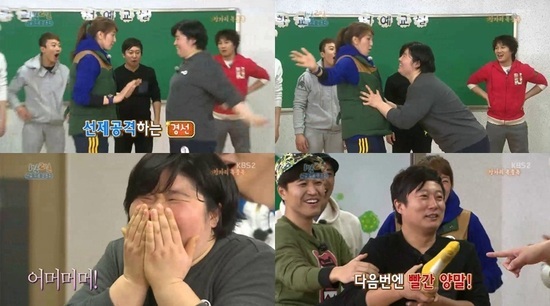 이날 방송에서 '1박 2일' 멤버들은 선팀과 란팀으로 나눠 잠자리 복불복 게임을 진행, 마지막 경기로 손뼉 밀치기 시합을 진행했다.