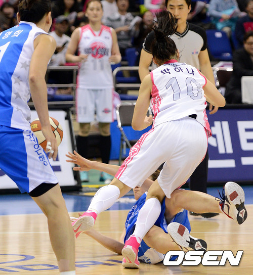 17일 오후 부천실내체육관에서 열린 'KDB금융그룹 2012-2013 여자프로농구' 하나외환과 우리은행의 경기, 3쿼터 하나외환 박하나가 루즈볼 다툼 중 우리은행 배혜윤과 충돌하고 있다.