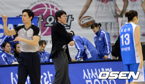 17일 오후 부천실내체육관에서 열린 'KDB금융그룹 2012-2013 여자프로농구' 하나외환과 우리은행의 경기, 3쿼터 득점없이 공격권이 넘어자가 우리은행 위성우 감독이 아쉬워하고 있다.