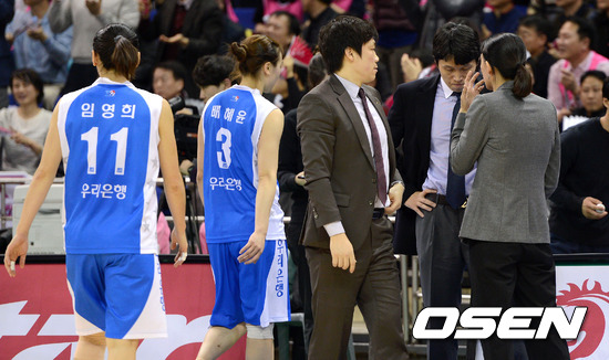 17일 오후 부천실내체육관에서 열린 'KDB금융그룹 2012-2013 여자프로농구' 하나외환과 우리은행의 경기, 4쿼터 작전타임때 우리은행 위성우 감독이 아쉬운 표정을 짓고 있다.
