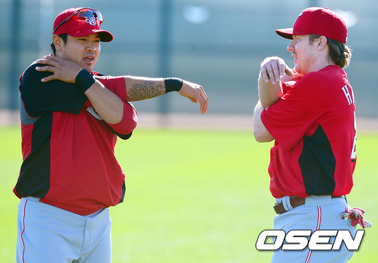 추신수가 하니건이 이야기를 나누며 스트레칭을 하고 있다