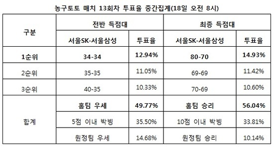 삼성의 승리를 예상한 참가자는 10.14%에 머물렀고, 나머지 33.81%는 양 팀 10점 이내 박빙 승부를 전망했다.