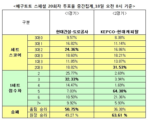 1경기 여자부 경기에서는 현대건설 승리(50.75%)가 도로공사 승리(49.27%)보다 근소하게 앞서며 현대건설의 승리를 예상했다. 세트 스코어 예상은 3-2의 현대건설 승리(24.36%), 2-3 도로공사 승리(18.82%)가 1,2순위로 최다 집계됐다.