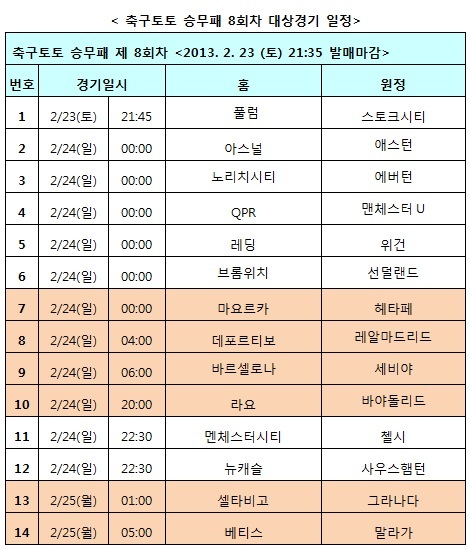 [축구토토] 국민체육진흥공단(www.kspo.or.kr)이 발행하는 체육진흥투표권 수탁사업자인 스포츠토토(www.sportstoto.co.kr)는 오는 23일부터 3일간 벌어지는 잉글랜드 프리미어리그(EPL) 8경기와 스페인 프리메라리가 6경기 등 총 14경기를 대상으로 한 축구토토 승무패 8회차 게임을 발행한다고 밝혔다.