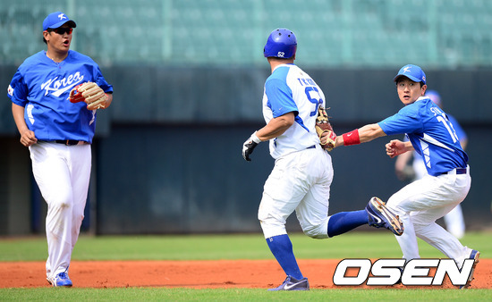 백팀 김태균이 한개 배팅 훈련에서 협살에 걸리며 청팀 손시헌에 태그아웃당하고 있다. 한개 배팅은 시뮬레이션 훈련에서 조금 변형된 훈련이다.