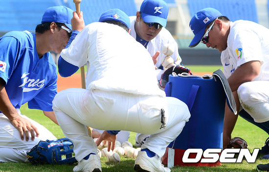 이승엽, 이대호, 김태균이 유지현 코치의 펑고를 받으며 수비훈련 마치고 볼을 주워 담고 있다.