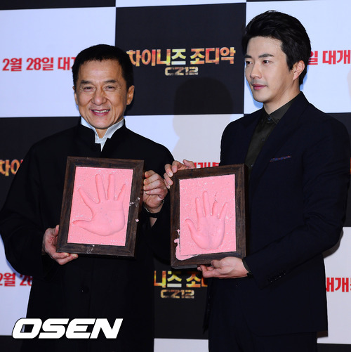 18일 오후 서울 중구 소공동 롯데 에비뉴엘에서 진행된 영화 '차이니즈 조디악' 레드카펫 및 VIP 시사회 행사에서 권상우와 성룡이 팬들 앞에서 핸드프린팅을 들고 포토타임을 갖고 있다.