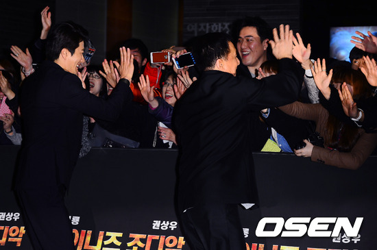 18일 오후 서울 중구 소공동 롯데 에비뉴엘에서 진행된 영화 '차이니즈 조디악' 레드카펫 및 VIP 시사회 행사에서 권상우와 성룡이 팬들과 하이파이브를 하고 있다.