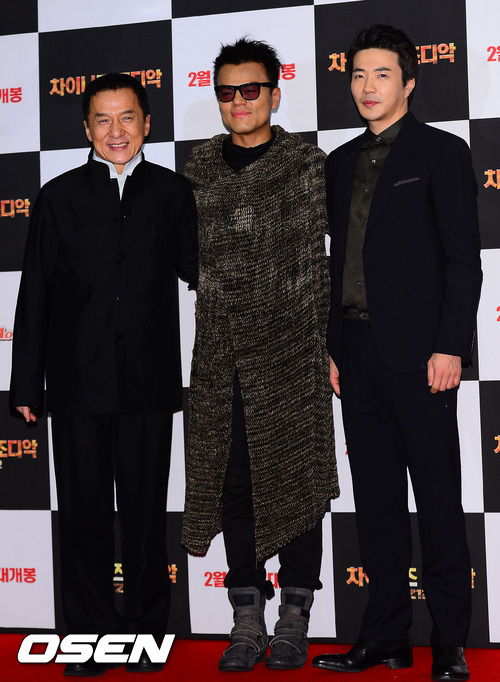 18일 오후 서울 중구 소공동 롯데 에비뉴엘에서 진행된 영화 '차이니즈 조디악' 레드카펫 및 VIP 시사회 행사에서 성룡과 권상우가 박진영과 포토타임을 갖고 있다.