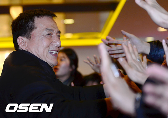 18일 오후 서울 중구 소공동 롯데시네마 에비뉴엘에서 진행된 영화 '차이니즈 조디악' 레드카펫&VIP 시사에서 성룡이 팬들과 하이파이브를 하고 있다.